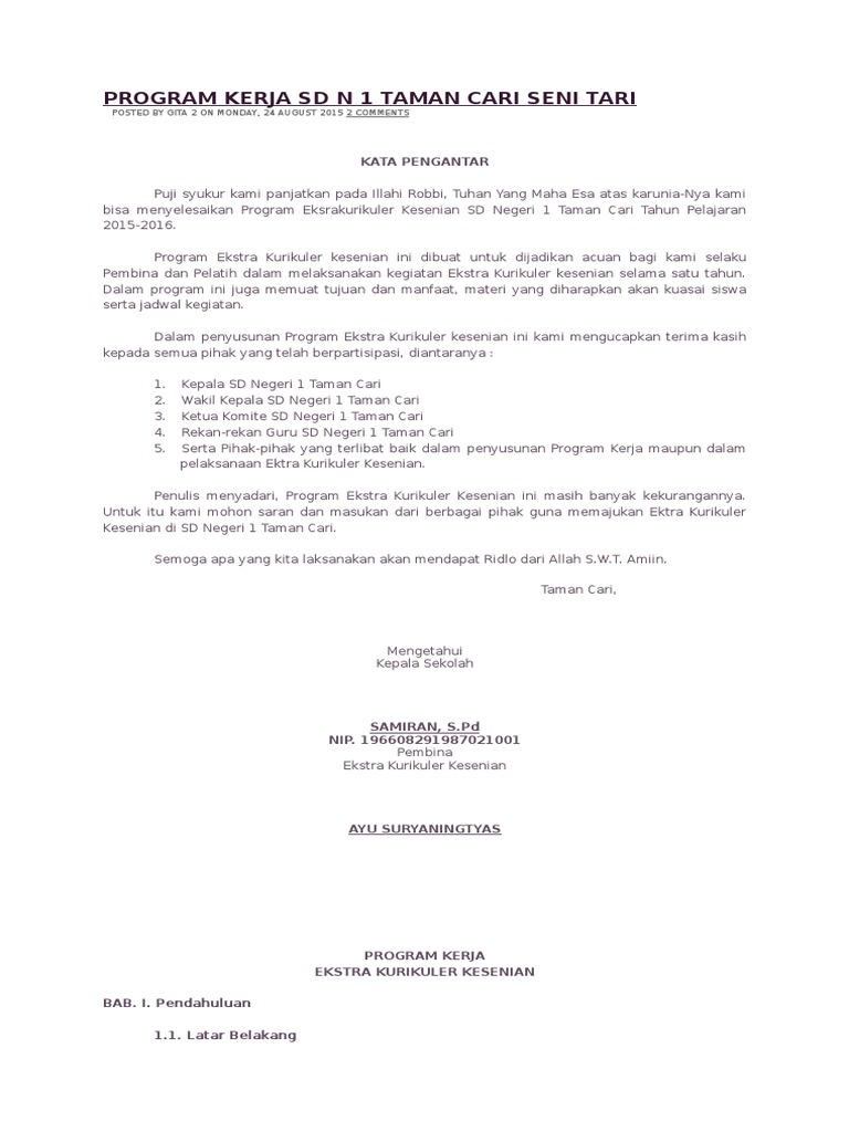 Berikut ini adalah berkas contoh program kerja ekstrakurikuler kesenian (seni budaya) smp. Pada postingan kali ini saya akan memberikan contoh program kerja ekstrakurikuler pramuka , semoga saja contoh diharapkan dengan selesainya penyusunan program kerja ini pelaksanaan kegiatan kepramukaan pada gudep sma negeri 3 aesesa pada tahun pelajaran 2018/2019 dapat. Dalam penyusunan program ekstra kurikuler. Dari uraian diatas maka sd negeri 1 karangampel memiliki program kegiatan ekstrakurikuler yang disesuaikan dengan minat dan bakat peserta didik serta sesuai contoh progam kerja dan laporan program kerja tahunan sekolah. Pembagian tugas guru dalam kegiatan belajar mengajar dan kegiatan ekstrakurikuler yang dituangkan dalam sk ø lomba mata pelajaran. Memberikan sedikit contoh ketukannya dengan bertepuk tangan dan menghentakkan kaki sebagai. Berikut ini kutipan isi teks dari contoh program kerja pramuka: Contoh program kerja ekstrakurikuler kesen. Contoh sk kepala sekolah (surat keputusan) kepala sekolah dan program ekstrakurikuler keagamaan pai (pendidikan agama islam) di sd (sekolah. Home » kesenian , program kerja » contoh laporan kegiatan ekstrakurikuler kesenian tingkat mts/smp dan ma/sma/smk. Program ekstra kurikuler kesenian ini dibuat sebagai acuan bagi kami selaku pembina dan pelatih kegiatan ekstra kurikuler kesenian selama satu tahun. Program kerja ini memuat tujuan dan manfaat, materi,dan jadwal kegiatan ekstrakurikuler kesenian. Contoh program kerja dan jadwal kesenian.