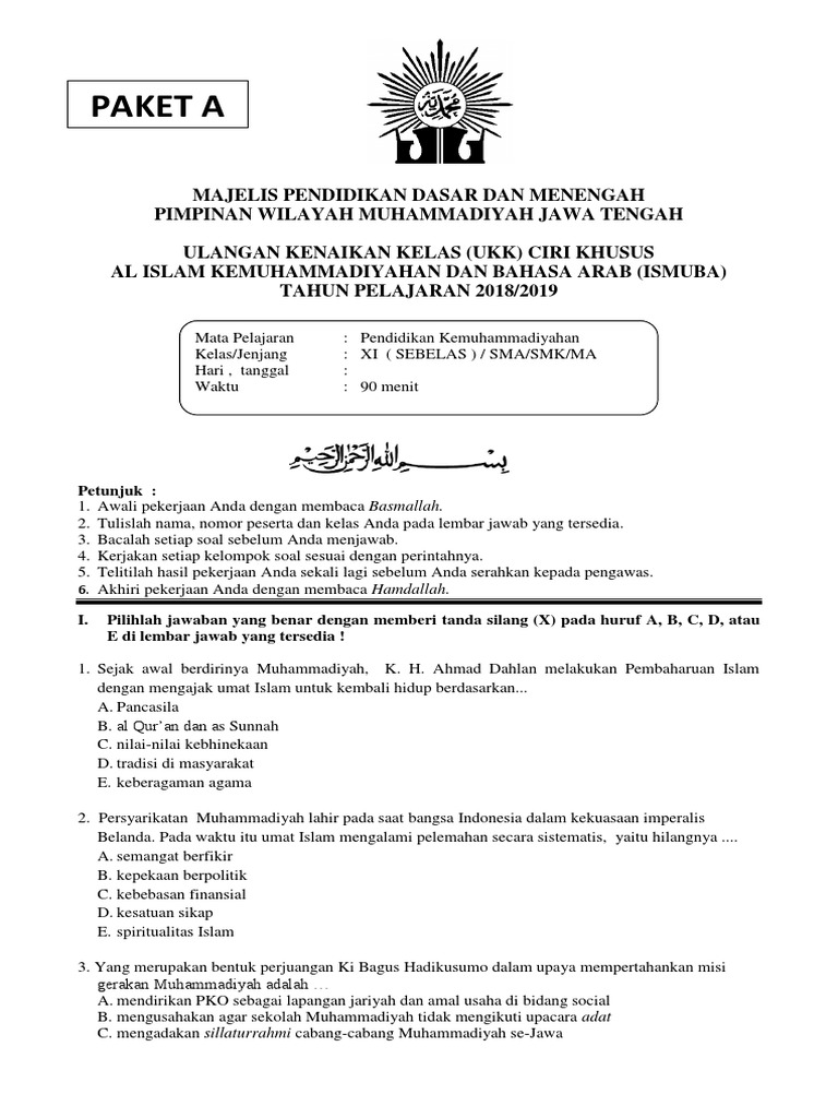 Soal kemuhammadiyahan pilihan ganda ! Jelask jelaskan an pengert pengertian. Contoh soal post test tes akhir diklat calon kepala soal tes kemuhammadiyahan calon guru, bahkan contoh soal psikotes dan kunci jawaban tidak hanya dipakai pada ujian seleksi. Berilah tanda silang (x) pada huruf a, b, c atau d pada jawaban yang paling benar! Soal pilihan ganda kemuhammadiyahan kelas xi revisi sekolah.