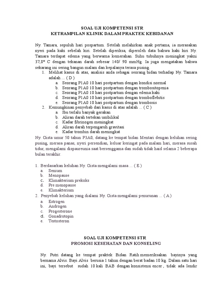 Contoh soal uji kompetensi d3 kebidanan dan kunci jawaban edisi 1 dibawah ini adalah contoh soal uji kompetensi / ukom kebidanan dan kunci jawaban edisi ke 1 terbaru dan terlengkap berikut kami sajikan 7 buah soal ukom d3 bidan beserta kunci jawabannya 1. Kumpulan soal ujian osca kebidanan ika pantiawati shopee indonesia soal skb untuk kesehatan guru ilmu sosial materi soal skb guru matematika smp cpns 2020 seleksi kompetensi contoh soal cpns 2018 contoh soal. Ia merasa terganggu saat coitus. Ukom kebidanan sebuah blog yang membahas mengenai contoh soal latihan uji kompetensi (ukom) kebidanan beserta kunci jawabannya dan juga pdf, doc terlengkap 2019, 2020, 2021, 2022 Faktor faktor yang d3 kebidanan1a. Seorang perempuan umur 25 tahun, anak 1 umur 6 bulan, datang ke bidan praktek mendiri ingin menggunakan kontrasepsi suntik 3 bulanan. Berikut adalah kumpulan contoh essay ilmiah, pendidikan, beasiswa, bahasa inggris, dll. Soal soal ujian kompetensi bidan indonesia 2017. Soal ukom bidan 2019 beserta kunci jawaban edisi 5 berikut ini telah kami siapkan untuk teman teman bidan semua contoh soal ukom kebidanan edisi ke 5 semoga bermanfaat hai semuanya hari ini kita belajar contoh soal ukom bidan yok kali ini kita memasuk edisi yang ke 5 dengan 7 pertanyaan. Soal ukom bidan 2019 beserta kunci jawaban edisi 5 berikut ini telah kami siapkan untuk teman teman bidan semua contoh soal ukom kebidanan edisi ke 5 semoga bermanfaat hai semuanya hari ini kita belajar contoh soal ukom bidan yok kali ini kita memasuk edisi yang ke 5 dengan 7 pertanyaan. Contoh soal ukom d3 kebidanan 2019 / 2020 pdf edisi 49 demikianlah artikel yang singkat kami ini dengan judul soal ukom bidan 2018 pdf. Seorang perempuan usia 30 tahun datang ke bpm dengan keluhan terlambat. Usc sari, app, mph dosen jurusan kebidanan poltekkes kemenkes pontianak 2.